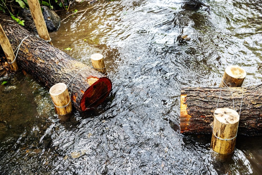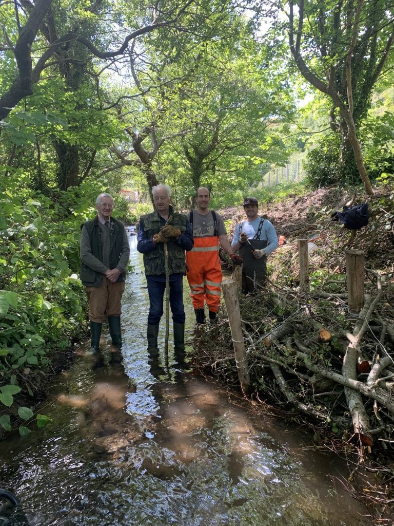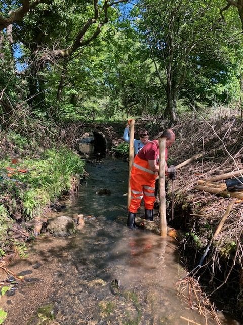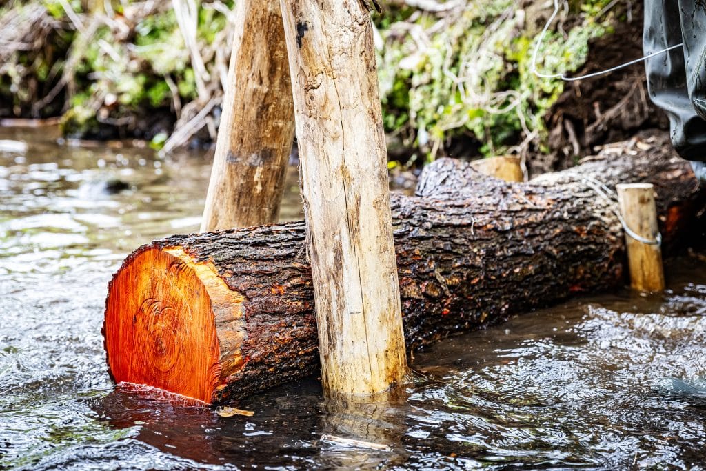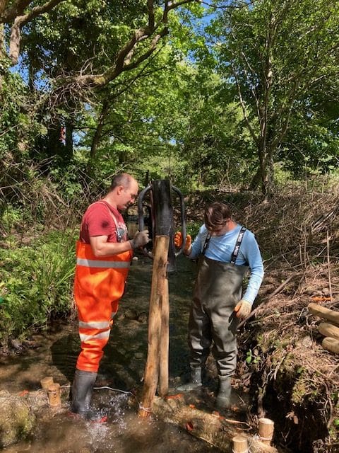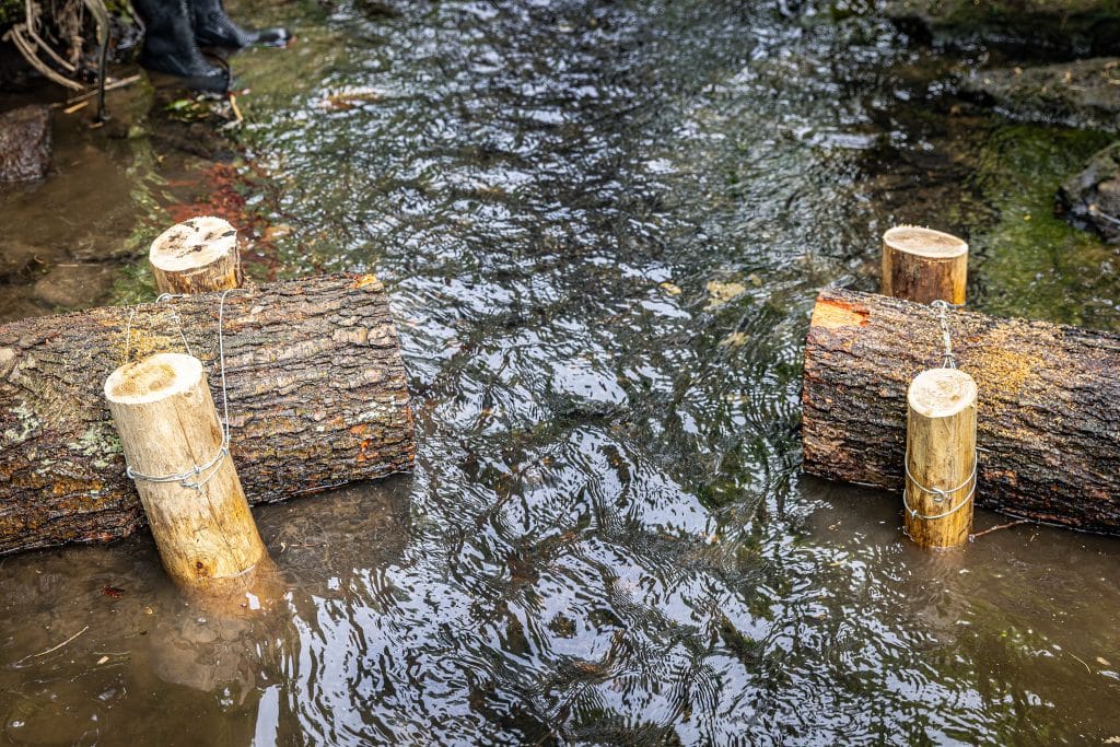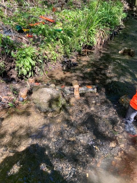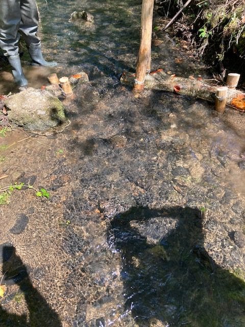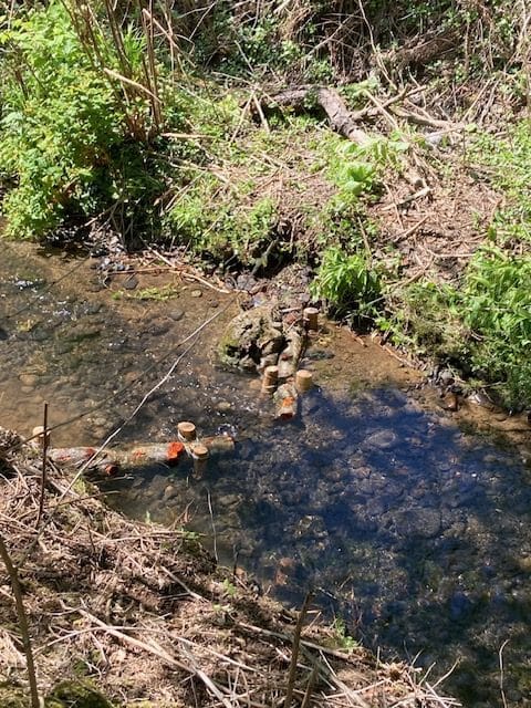 Following a successful but not yet completed invasive species treatment program which resulted in significant knockdown of JKW, the next part of the restoration was now ready to progress. In early May this year (2025) the final stages of the restoration started. Bank revetment and installation of wooden structures in the stream was the plan to create a complex and varied habitat. The structure designs would encourage the water flow to scour out areas suitable for egg laying and cover for the smaller fish and invertebrates. These structures also add complexity to the channel, helping to create pools and gravel beds and they support invertebrate life by trapping nutrients for key species groups such as mayflies, stoneflies and caddis species. These also provide additional habitat for fish, and help provide shade, shelter from high velocity flows, sites for feeding, spawning and nursery areas as well as refuges from predators. WWRT and a number of our club volunteers set to work on the first stages. The inverted “V” structures pinch the flow and create increased velocity in the centre. During heavy rainfall and flood conditions, the water tops the “V” and scours a deeper section behind the logs. In addition to the “V” structures made from Alder and Chestnut staves, bank deflectors were also constructed and covered with Willow brash to create cover. The pictures below some of the structures completed however there are more planned.